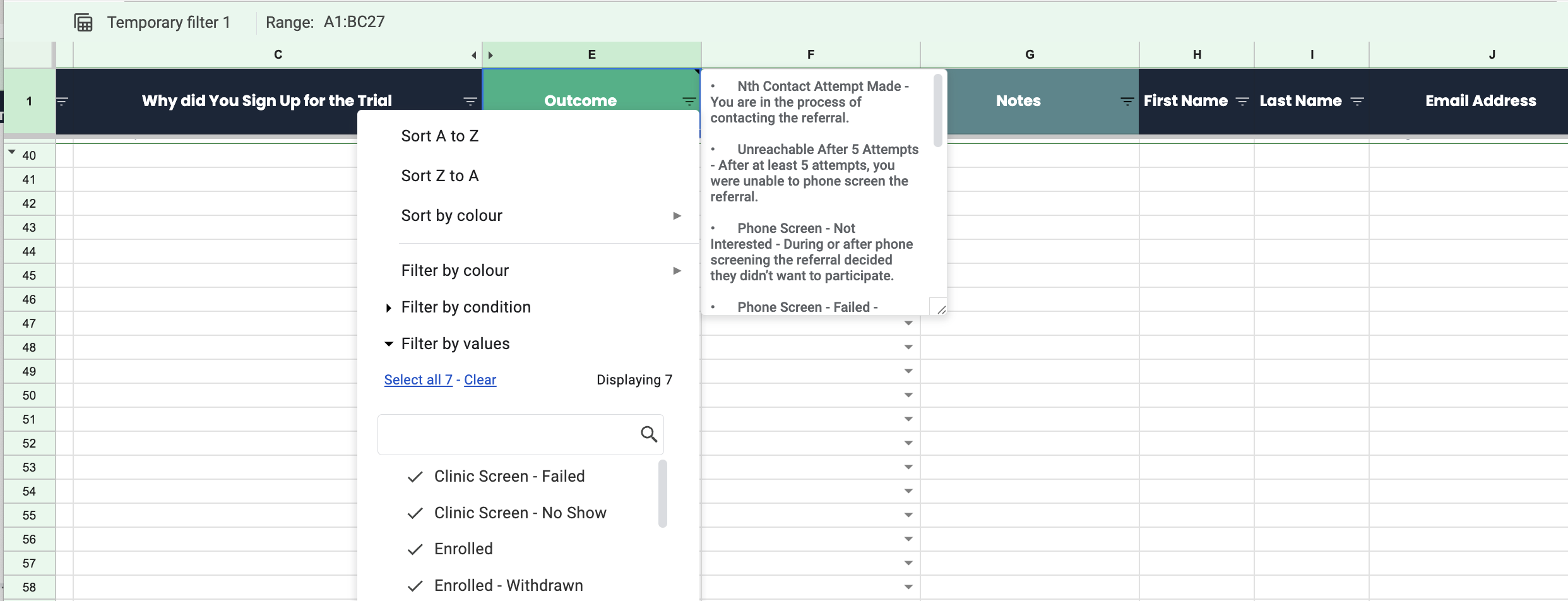 The filter view function of Google Sheets allows you to filter and analyze referral data in the Referral Spreadsheet without affecting the view for other collaborators. It also ensures that the integrity of data automatically pushed by Trialfacts into your referral spreadsheet remains uncompromised.