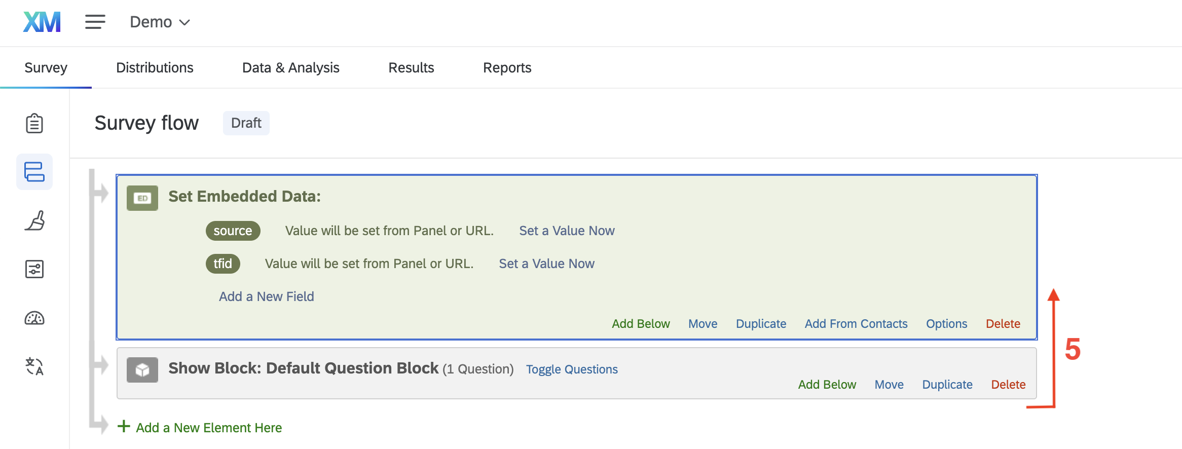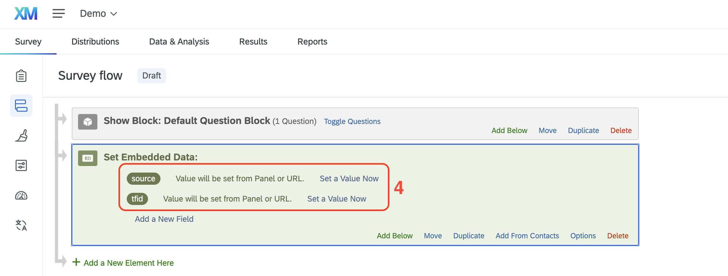 In this guide, the source and tfid fields are saved as embedded data, allowing you to identify referrals redirected from a Trialfacts prescreening questionnaire.